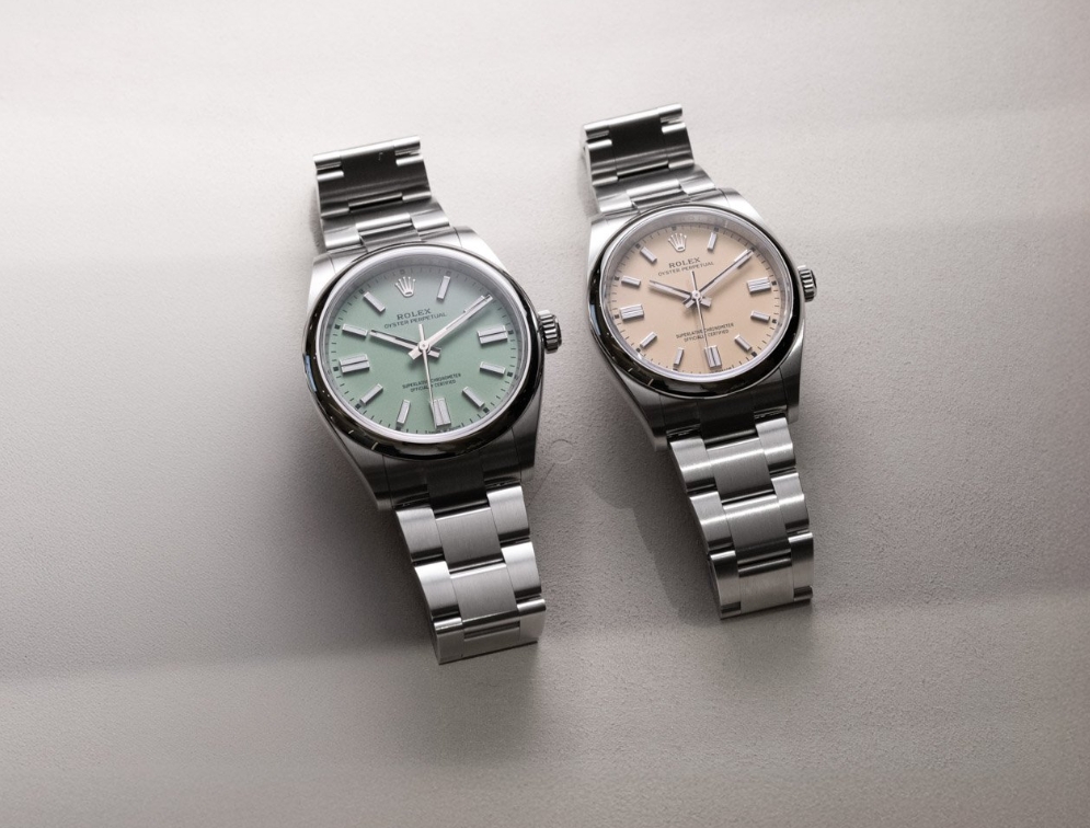 Size matters. That’s certainly the case for the Rolex Oyster Perpetual that comes in no fewer than five sizes — 28, 31, 34, 36, and 41mm. This year, The Crown introduced three soft and shimmering pastel colors — lavender, beige, and pistachio. In addition, there’s a new glossy black lacquered dial and a “med blue” dial that looks like the waters of the coast of Santorini. If choosing between these perfectly executed dial colors wasn’t enough, choosing between a Rolex Oyster Perpetual 36 and 41 can be agonizing. Don’t worry; keep breathing, and it will all be okay. Fratello to the rescue!
